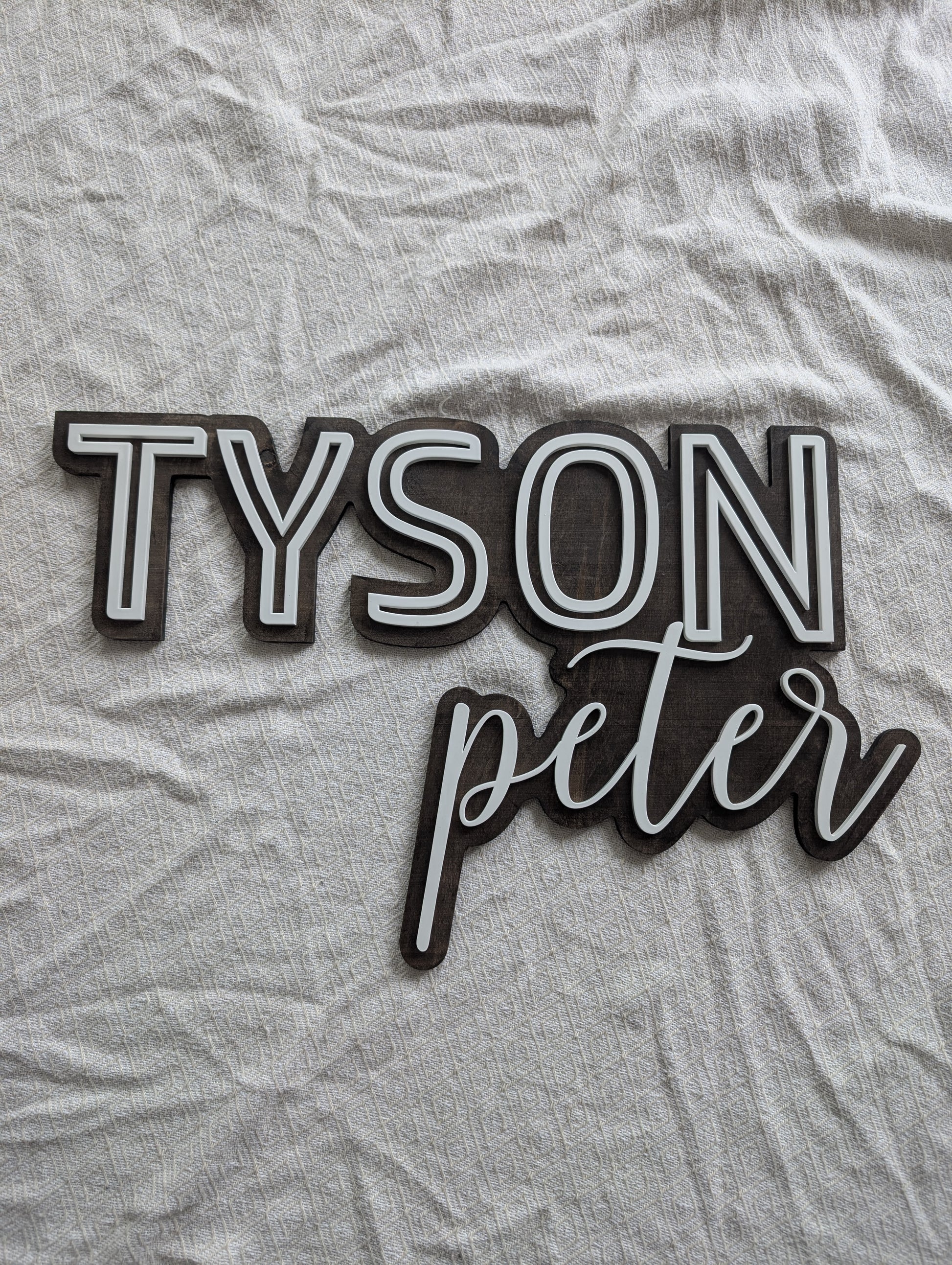 Introducing our unique Name Sign made from high-quality wood and expertly stained and painted for a stunning finish. Personalize your space and add a touch of elegance with this customizable sign. Perfect for weddings, nurseries, and home decor. Make a statement in style!