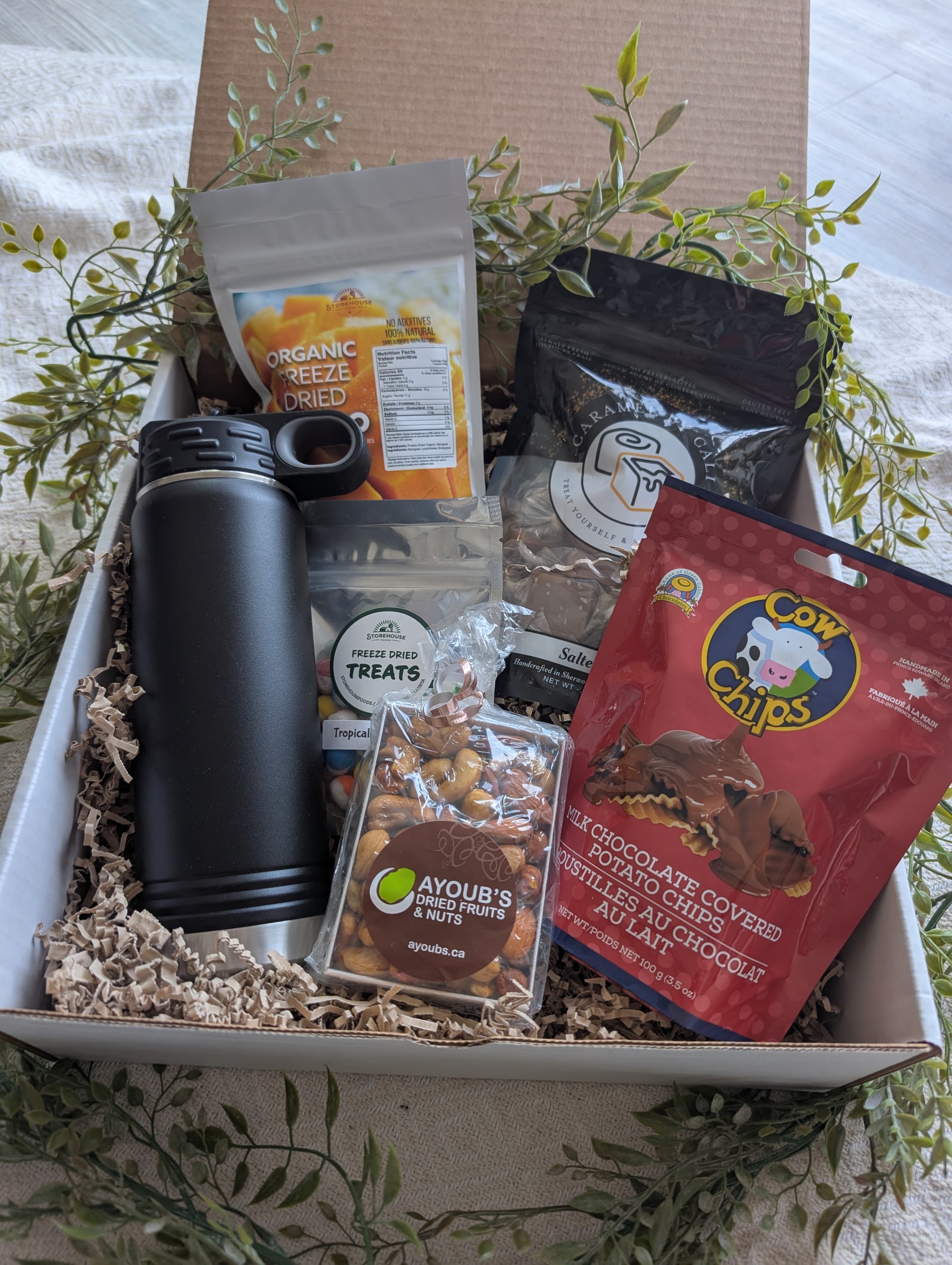 Impress clients and employees with this Snack Break Survival Kit, a premium gift set featuring freeze-dried mangos, candy, nuts, chocolate-covered chips, and luscious caramels—all proudly made in Canada. Customize the included water bottle with your business logo for a memorable, professional touch. This unique combination of delicious snacks and personalized branding makes Sweet Treats the perfect way to showcase your company’s appreciation and leave a lasting impression.
